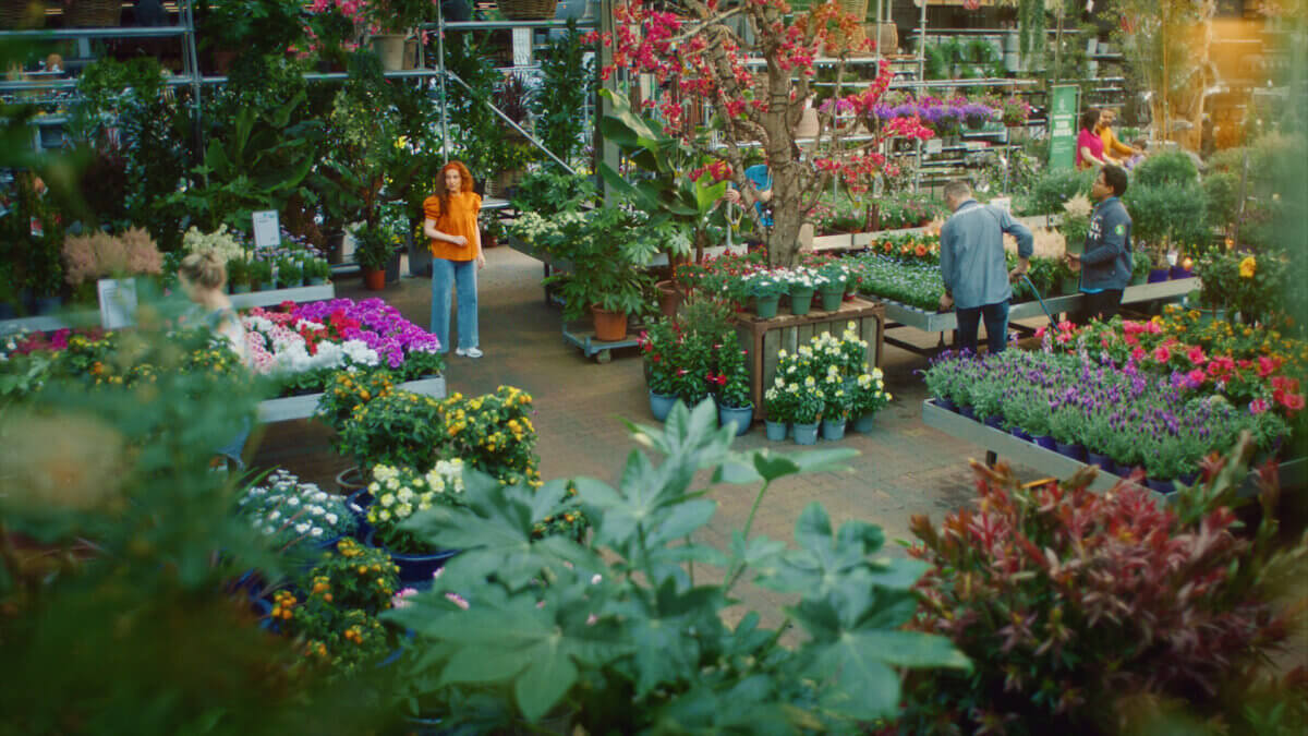 In an enchanting experience a woman explores the aisles of Intratuin where blooming flowers, budding shrubs and fresh greenery await her discovery. Each step she takes brings new inspiration to create her own garden paradise.